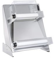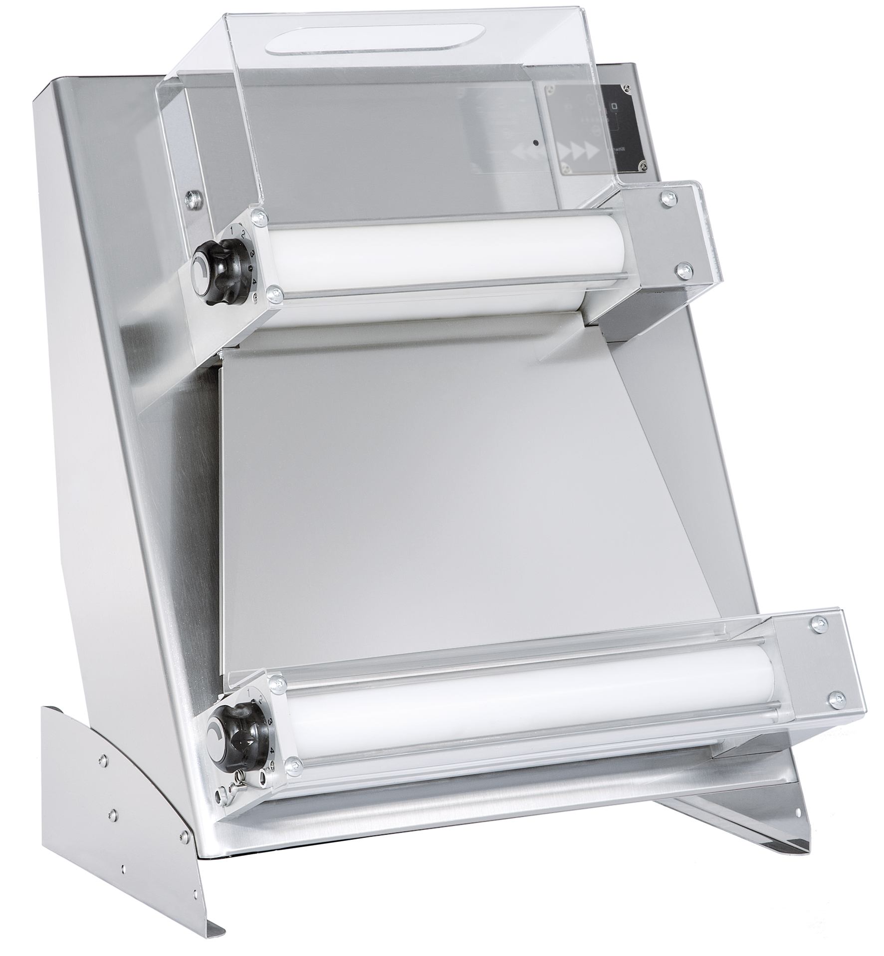 Twee sets verstelbare rollen vormen het deeg tot een schijf van dikte van 0 tot 4 mm.